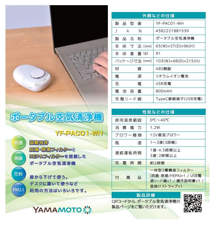 ポータブル空気清浄機 HEPA・国際特許技術使用の抗菌・除菌フィルター