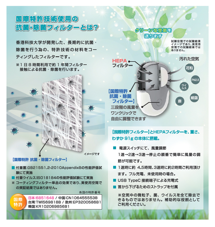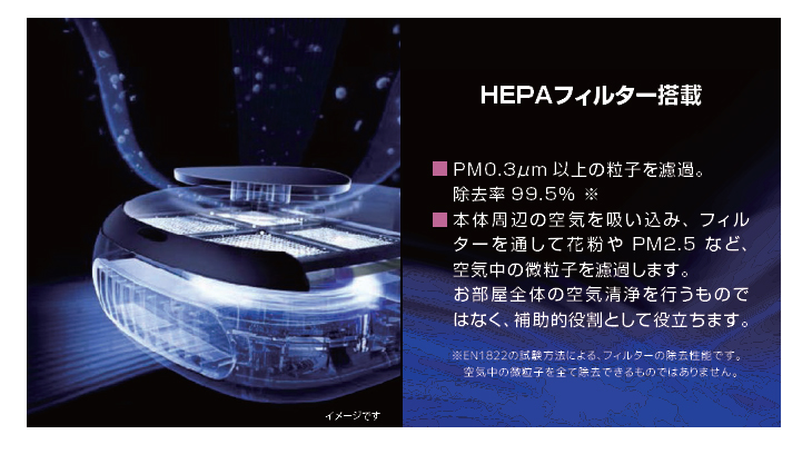国際特許技術使用の 抗菌・除菌フィルターとHEPAフィルター搭載!