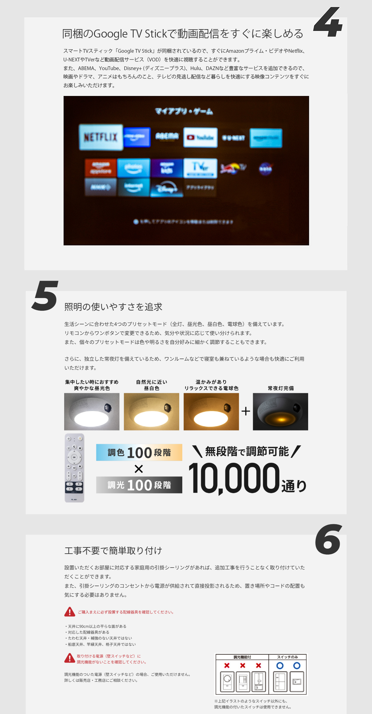 ・シーリングプロジェクターのHDMI端子に差し込むだけで、Netflix、YouTube、TVer、Abemaなどの動画サービスをフルHD(1080p)画質で視聴可能です。