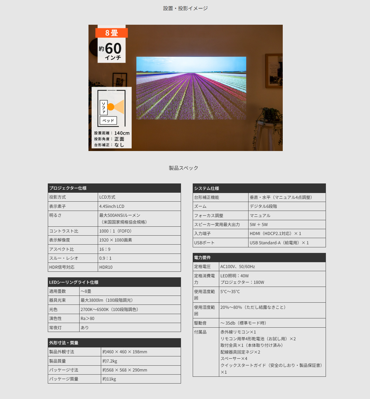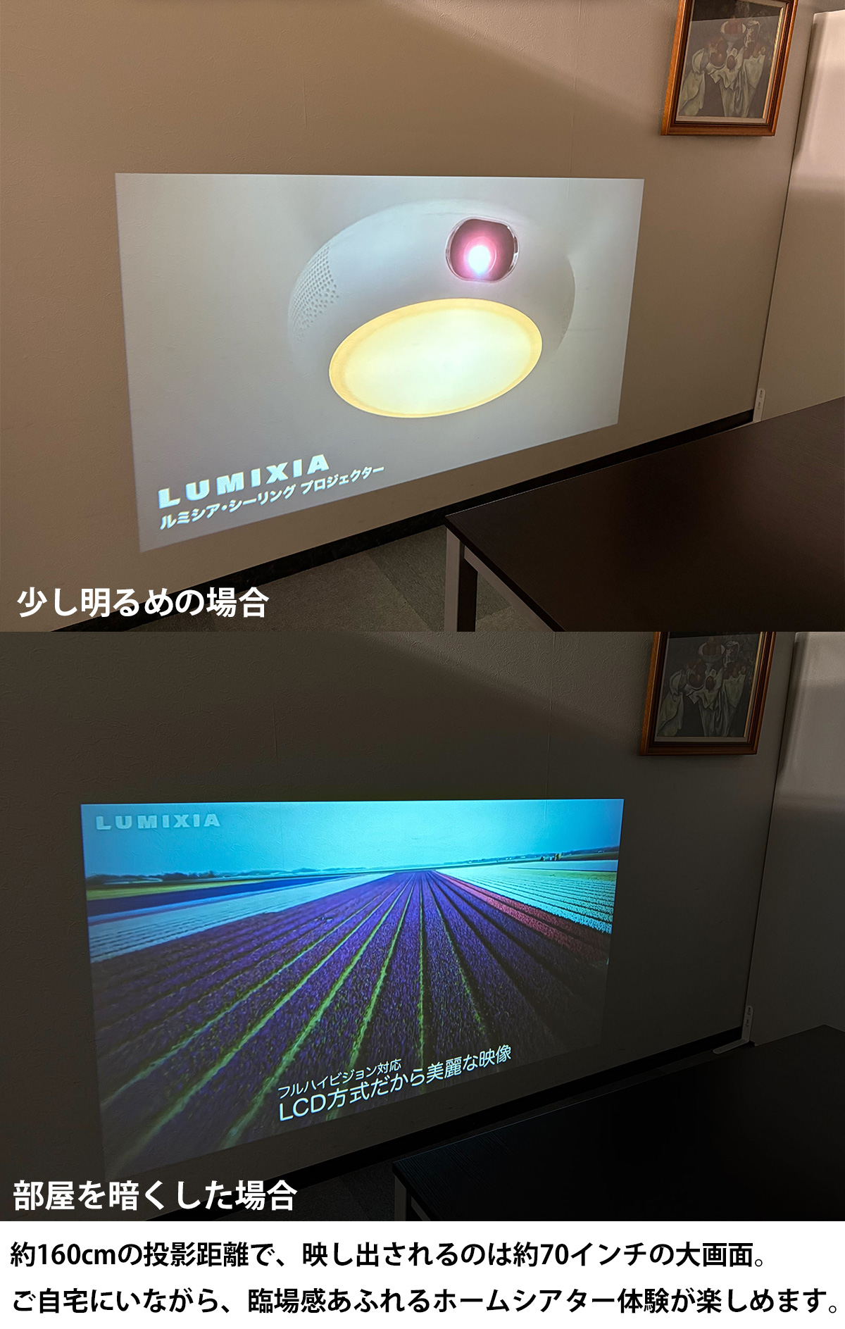 ■壁との距離が近くても投影可能。上下左右に調整できるから、見たい場所に投影可能です。