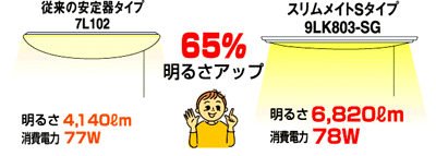 | 従来品に比べて、ほぼ同じ消費電力で明るさが約1.6倍!とても明るい照明です。 |
